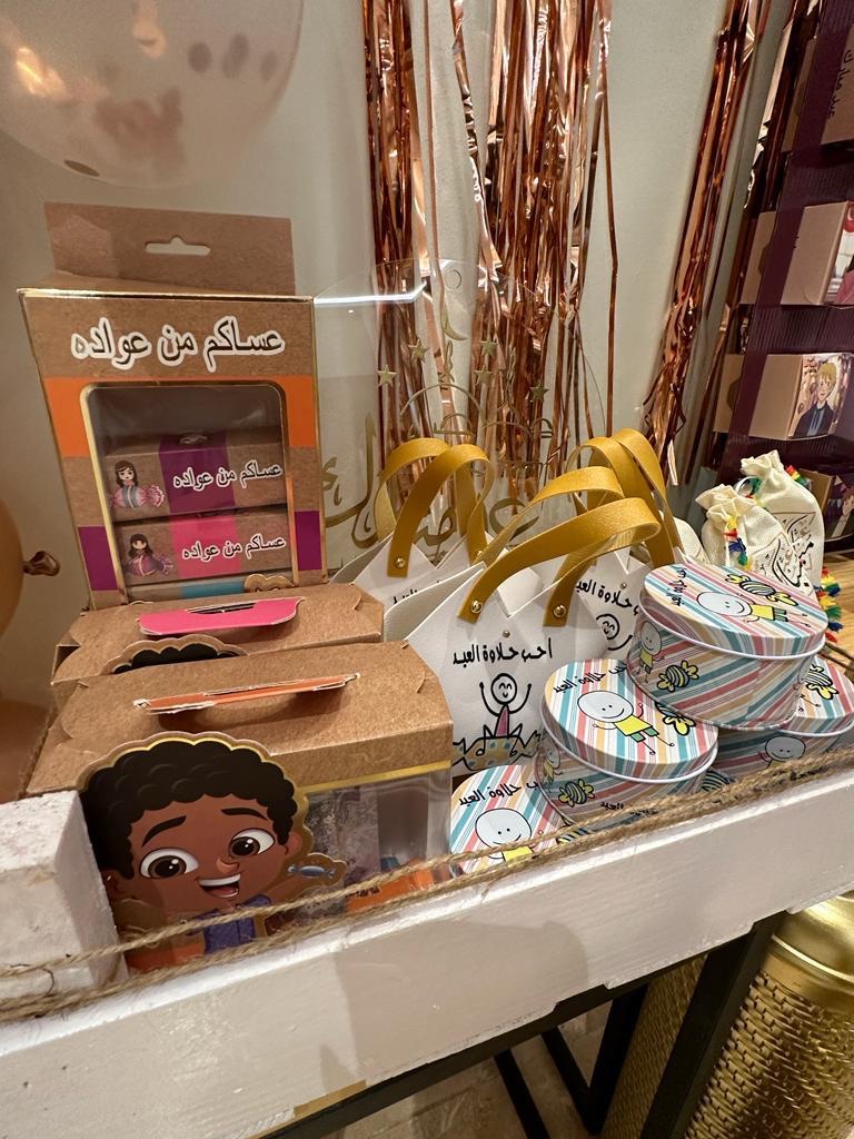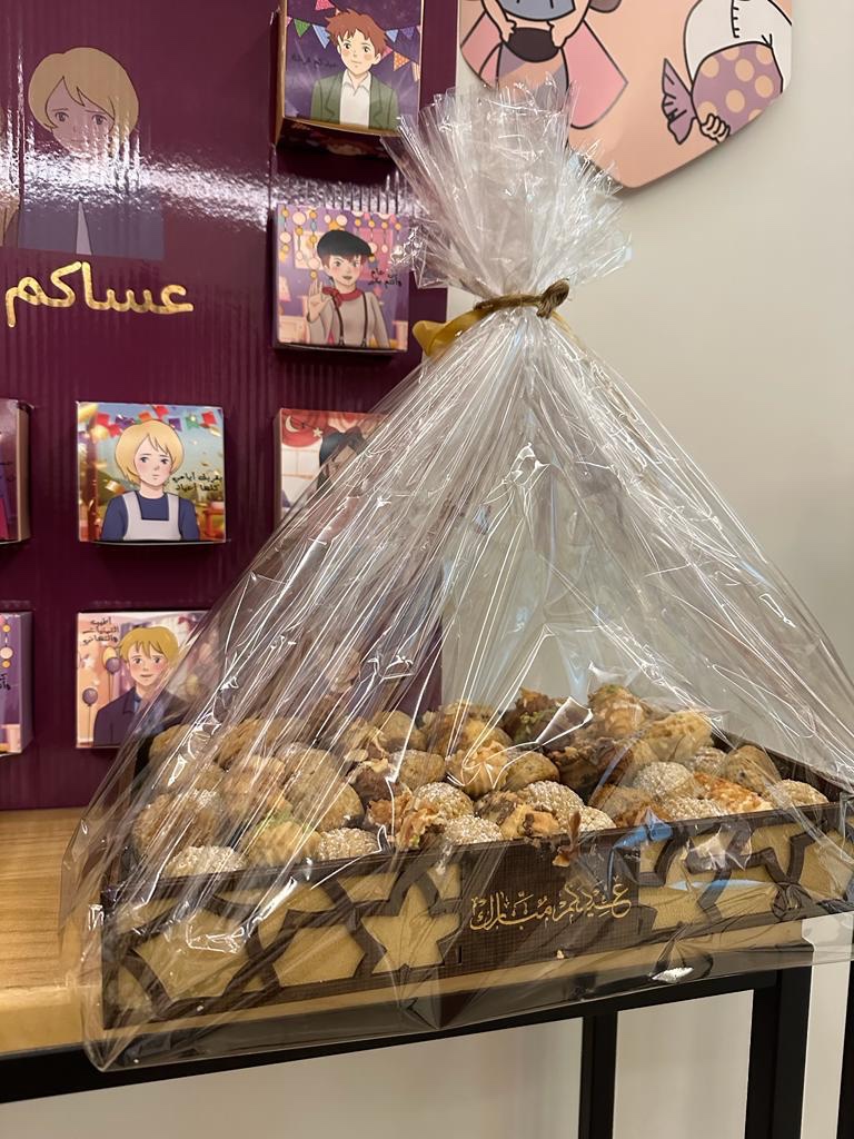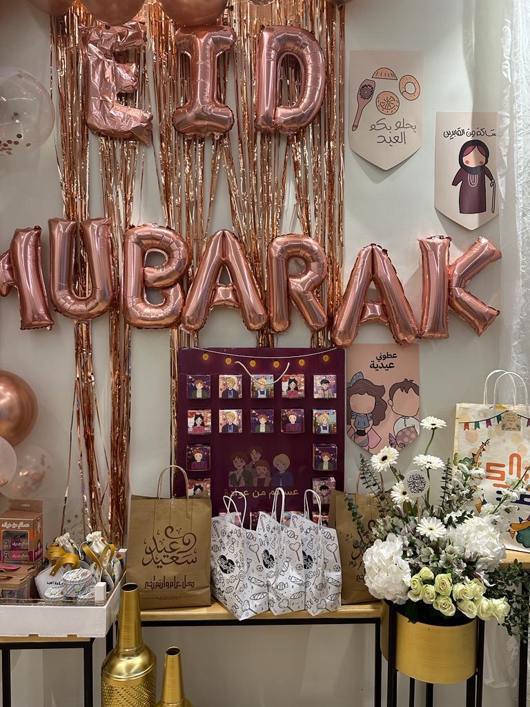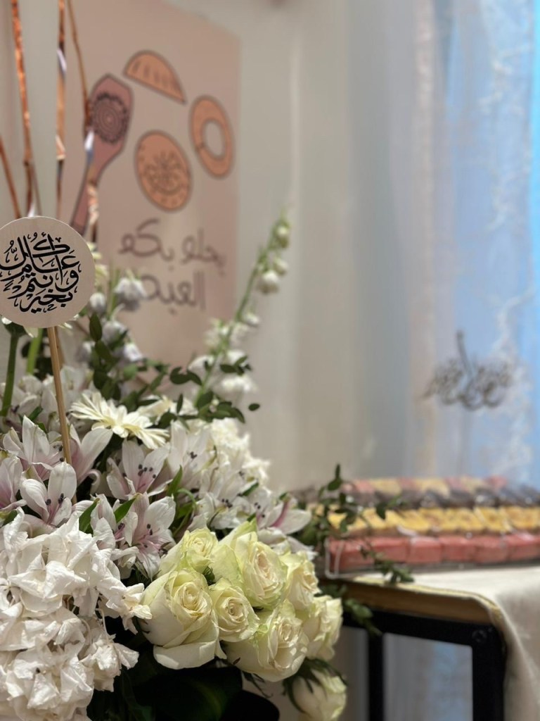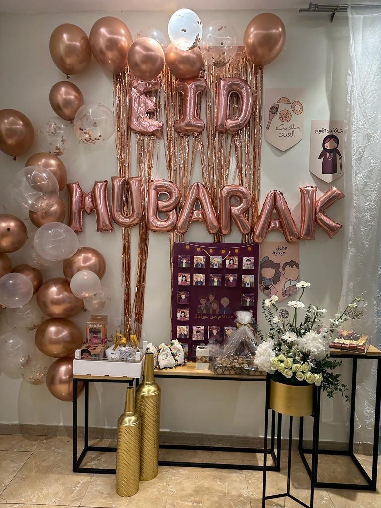 لاتكتمل بهجة العيد الا بفقرة تزيين الحائط ومدخل منزل أهلي باالبالونات الملونة،وصنعنا انا ودودي ابنة اختي وحبيبة قلبي لوحة رائعة تحمل عبارة عيد مبارك ،تنشر الفرحة في قلب من يراها ولايمر بجانبها الا ويقف لحظة ليصورها ويستمتع بها، ووضعت فازة الورد التي احضرتها هدية لأهلي وهم يستحقونها ، ومن ثم صواني الشكولاتة اللذيذة والبتيفور الهش وبجانبها عيديات الصغار والكبار ، بعد الانتهاء منها تأملتها وأنا مبتسمة وأردد في داخلي الله يرحمك ياأبي لو كان بيننا الآن كان سيفرح بها كثيراً ، عيدك بالجنة أجمل يارب .