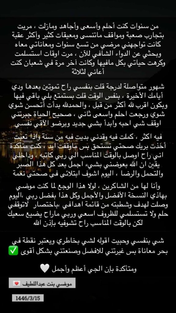 مر شهر سبتمبر جميلاً لطيفاً خفيفاً على روحي وعقلي وقلبي معاً ، يعود الفضل لمرور أيامه بتلك الحلاوة لله وليس بفضلي فالحمدلله كثيراً ، بدأت أشعر ان حياتي ترتبت أكثر من قبل وأصبحت لدي خطة مرسومة لما أريد السير فيه ، وأهدافي واضحة لأكمل السعي بها إن كانت لي خيراً بإذن الله ، عقدت ايضاً صداقات جديدة لإرواح تشبهني وكنت ابحث عنها دوماً واتمنى ان أكون بينهم، أحطت نفسي بأشخاص صالحين جداً أحببت صحبتهم وشاكرة لله على وجودي حولهم ، وأكثر ما زاد سبتمبر بهجة ان تلك النوبات الشديدة من الألم لم تهاجمني طوال الشهر ، نعم ذهبت إلى المستشفى ولكن ليس بسببها لذا الحمدلله على ما أنا عليه اليوم ، أدونها بقلمي وأنا مبتسمة قد تراها بسيطة ولكن أراها شي عظيم جداً يكفيني ان بينها هدفين كنت أسعى اليهم واحداً منذو سنه والآخر منذو شهور ،فخورة بنفسي وأحبها كثير وهي تستحق مني كل هذا الدلال والتميز والمكافأة ، أحبك موضي أنت حقاً شجاعة ومعطاءة ولديك إرادة من حديد الحمدلله ربي .